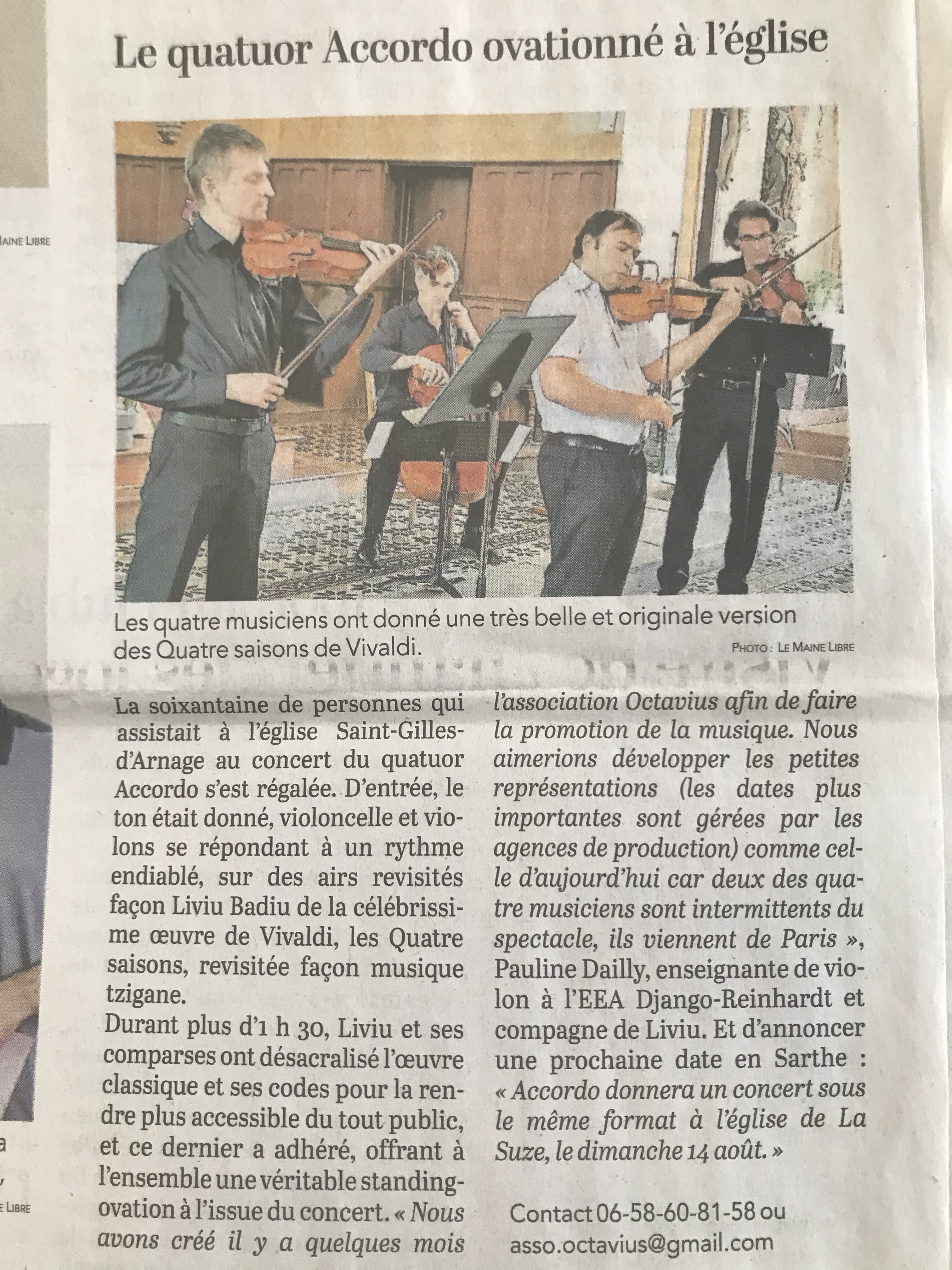 "Le quatuor ovationné à l'église" Publié dans Maine Libre le 2022-10-07 Lire l'article dans la source